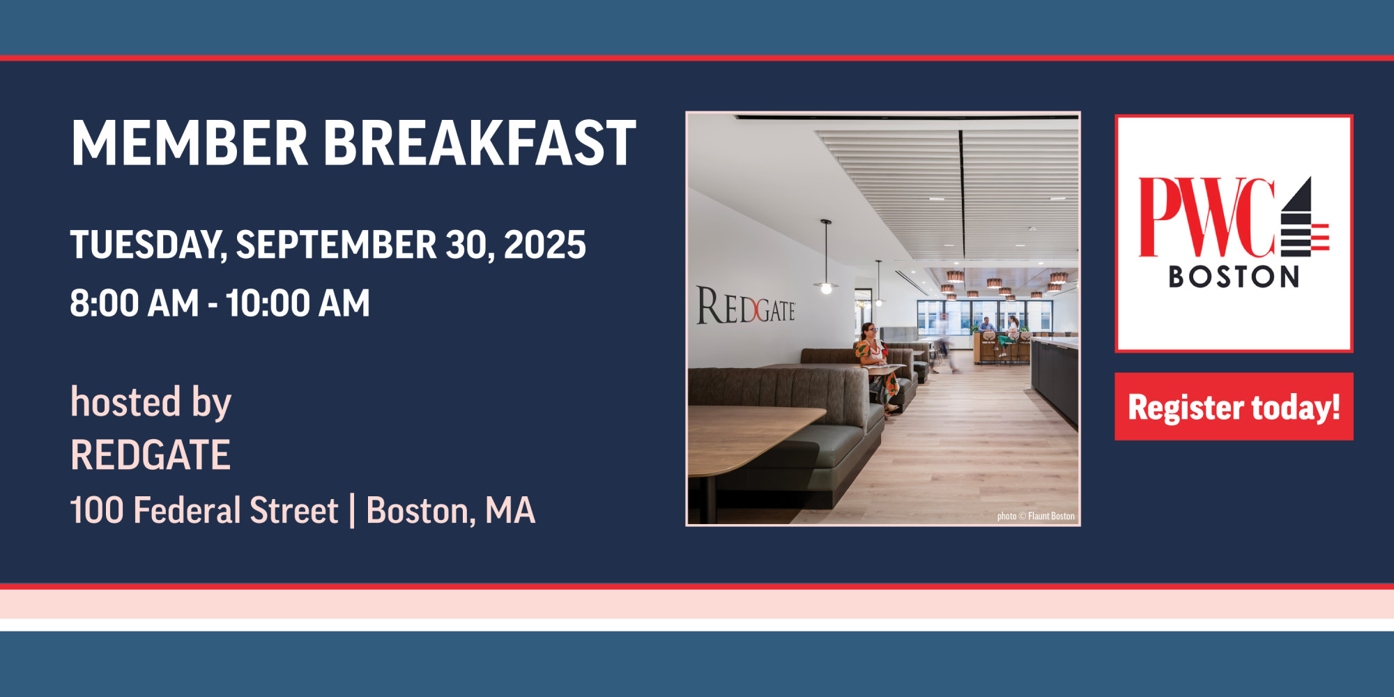 Join us for a special PWC Boston Member Social, hosted at Redgate’s new office at 100 Federal Street. This is a wonderful opportunity to connect with fellow members over a delicious breakfast and meaningful networking. Whether you're looking to strengthen existing relationships or spark new ones, this morning gathering is the perfect setting. Have a friend or colleague who might be interested in PWC Boston? Bring them along! Members are welcome to invite up to two non-member guests to experience the energy and community of our network firsthand.